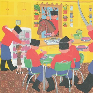 Las ilustraciones condensan esas particularidades, arrojan otras pistas y son tan notables como el texto: plastas de colores vibrantes, trazos gruesos y simples, una fuerte influencia naif y perspectivas llenas de estudiadas simetrías y diagonales que atrapan la mirada.