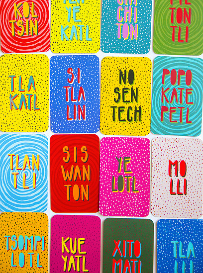 Memorama NáhuatlTe va a encantar este juego desde que veas la cajita en la que viene guardado. Luego, al abrirla, como si fuera un cofre, encontrarás dos manojos de bonitas tarjetas: uno de palabras escritas en nawatl y otro de imágenes. Son 36 diferentes: animales, personas, comida y cosas de la naturaleza. Para jugar, ya lo sabes: coloca boca abajo todas las tarjetas y luego voltea una y otra ¿hacen par? ¿Ese dibujo de la lluvia se corresponde con la palabra kiawitl o sitlalin? Acuérdate que rana se dice kueyatl; perro, chichiton; conejo, tochtli y gato, micho. Las palabras para hablar de comida son más fáciles: Chilli, Nohpalitl, Molli, Xitomatl, Awakatl, seguramente que esos serán los primeros pares que te lleves. Además de pasar un rato muy entretenido con tus amigos o familia, memorizarás palabras del idioma más hablado en México después del español.