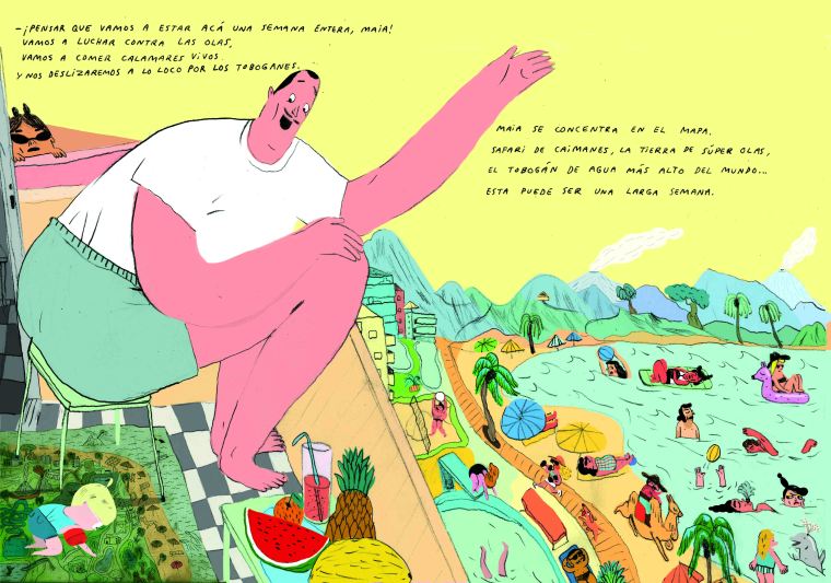 Vas a maravillarte con estas ilustraciones agigantadas y ondulantes. Te darán ganas de apretarlas o moldearlas como si fueran de plastilina, o dibujar tú también esas líneas que se parecen tanto a tus propios dibujos pero que revelan mil detalles y estilos que nunca habías visto juntos. Toboganes, albercas, lentes de sol, palmeras, monos y un montón de gente que quiere comprar un helado. Todo el alucinante despliegue visual acompaña las palabras de una inolvidable historia para llevar de vacaciones, para deslizarla bajo la almohada o para leerla con quien quieras en tu sillón favorito.