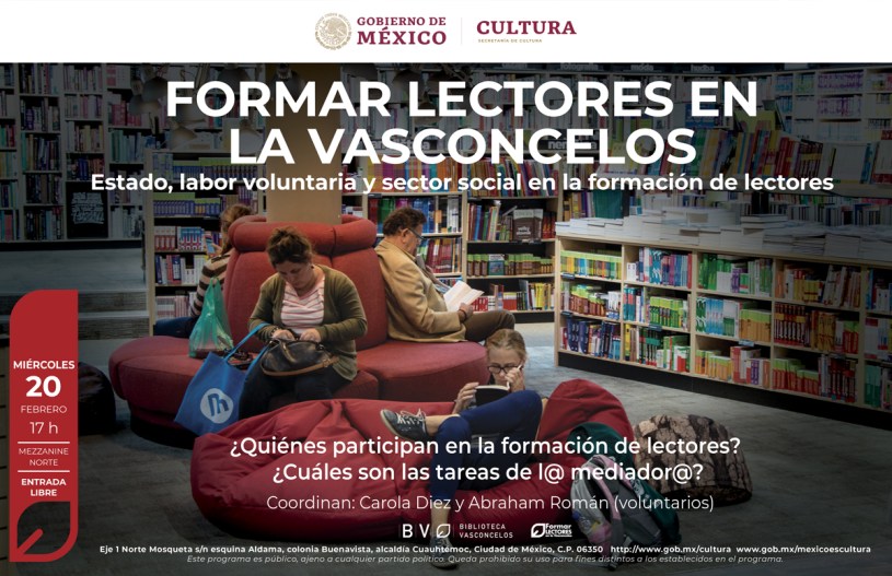 Lo espera y lo emprende: Carola es una de las ex colaboradoras que continuará proponiendo actividades de manera voluntaria a la Vasconcelos con el objetivo de «sostener acciones y servicios que han demostrado ser de utilidad, tener buena respuesta y coste cero», como me contó. La próxima es mañana 20 de febrero, un encuentro abierto para mediadores y mediadoras de lectura que inició con  Abraham Román en septiembre de 2018 y que está prevista para concluir en julio de este año: «Formar lectores en la Vasconcelos». En esta ocasión el tema: «Estado, labor voluntaria y sector social en la formación de lectores» Con preguntas eje como: ¿qué responsabilidad tiene Estado en la formación de lectores?, ¿cuáles son las tareas de l@ mediador@?, ¿es necesario el trabajo no remunerado en favor de la lectura?, ¿cómo se está viviendo la transición política en el sector cultural? A las 17:00 horas en el mezzanine norte de la BV. Como nota al pie, es curioso que en el diseño del flyer hayan puesto la imagen de otra biblioteca ¿o una librería? «Detalle» sintomático del corto circuito sucedido allí dentro (donde hay carpetas con cientos de miles de fotos de registro de las actividades).