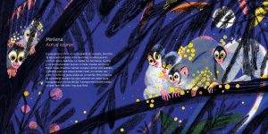La ilustradora responde dibujando en las alas una transparencia que no tienen las mariposas reales. Su propuesta, digital, que reproduce una técnica seca (lápiz de color, ceras o pastel), equilibra detalle y abstracción: movimientos ondulantes llenos de texturas en primer plano sobre fondos más llanos, aunque siempre coloridos, garras afiladas y bigotes finos frente a rostros más caricaturescos, como los de las luciérnagas. En este juego de contrastes a veces irrumpen formas elípticas, ricas floraciones y paisajes urbanos desdibujados. Cada doble página pareciera una noche distinta. El uso del color, no realista, es una oportunidad que ofrece la noche y la ilustradora la explora gozosamente. Ese placer, de ronda, es pura armonía con los textos que hacen de este libro una fiesta.