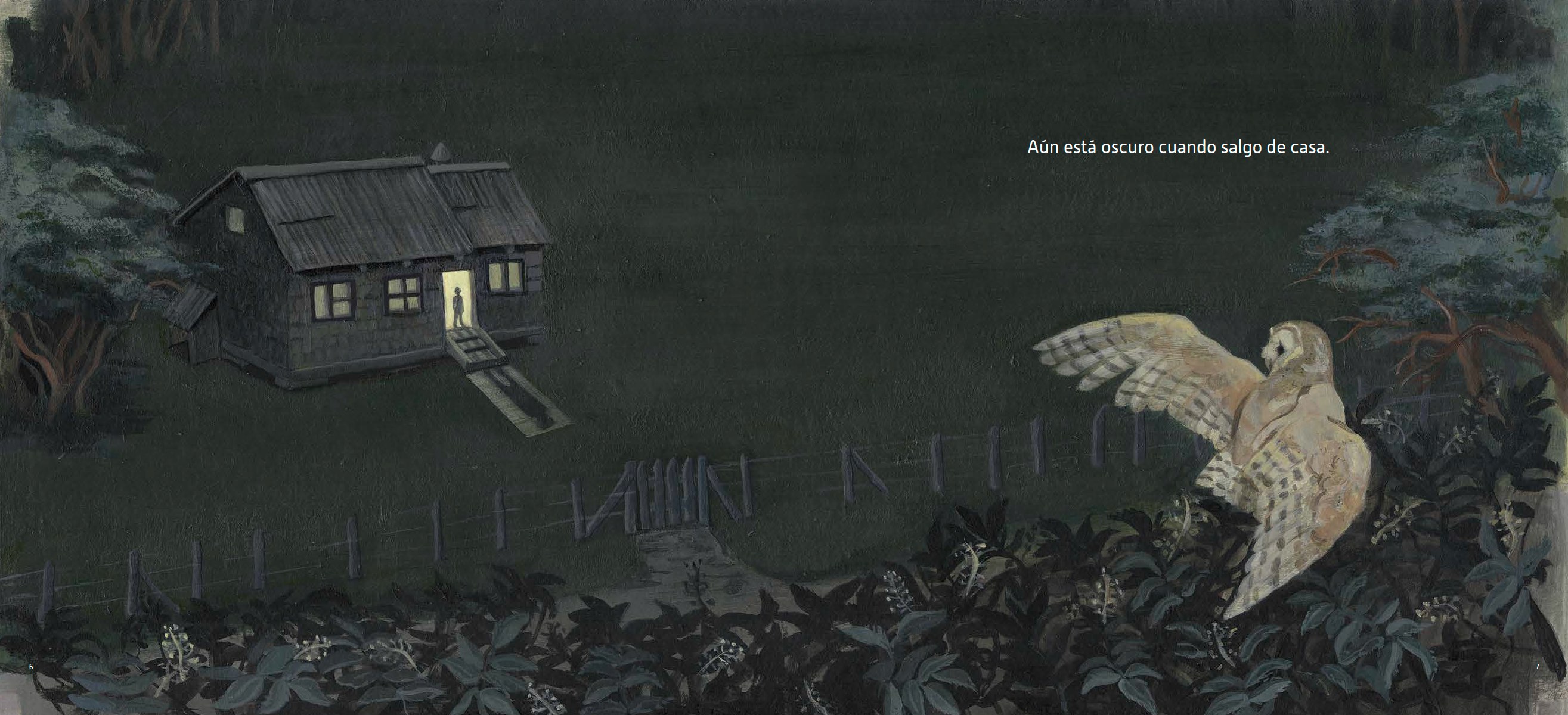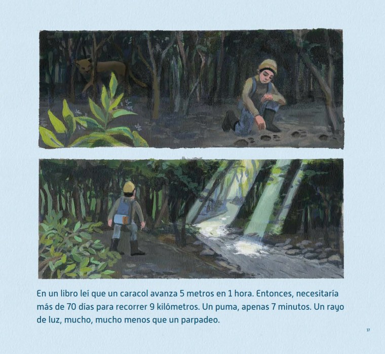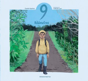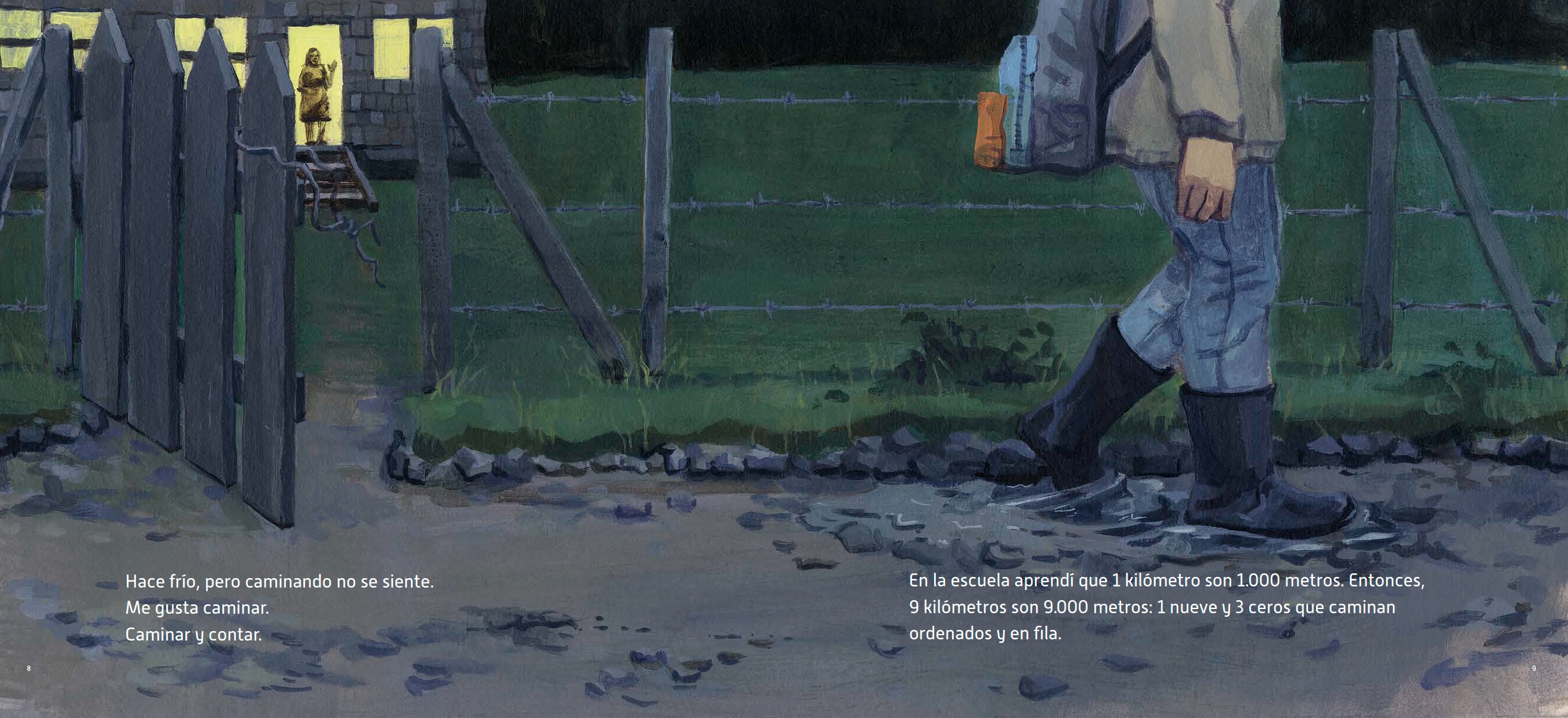9 kilómetros, como lo anticipa el título, es la historia de un trayecto. Un niño sale muy temprano de su casa, «cuando aun está oscuro», para dirigirse a su escuela a pie. Camina y (nos) cuenta metros, mariposas, minutos, moras, saltos y pasos que animan su viaje y traducen las abstracciones numéricas: «La profesora dijo que se necesitan unos 1.600 pasos para avanzar 1 kilómetro… 9 kilómetros serían casi 15.000 pasos. ¡Muchísimos! Pero yo creo que son menos, porque también busco atajos, corro, salto». Me recuerda a Valentina, la niña en La vida secreta de los números de Vladimir Rivera y Ales Villegas, sólo que ella avanza hacia los brazos de su madre en un entorno citadino, el de Santiago de Chile, y este niño nos traslada al interior del país (también Chile, el sur) y comparte el camino con pájaros.