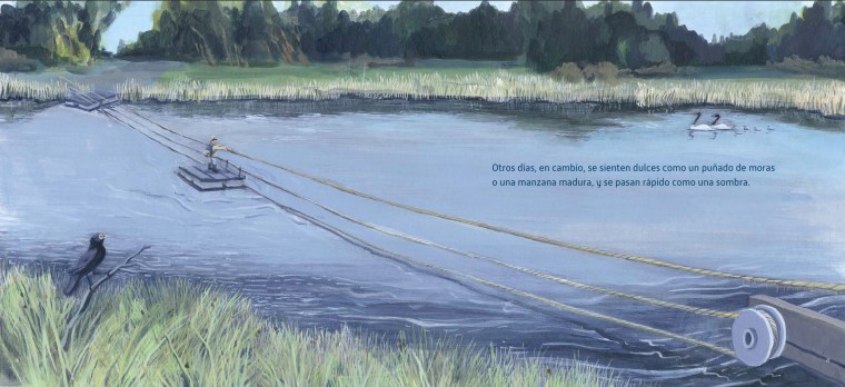 Igual que las perspectivas. El movimiento de la mirada que proponen las imágenes es una iteración del movimiento físico y oral del niño, que sube y baja y dice de muchas maneras esos 9 kilómetros. Hay agilidad pero no prisa. La narración gráfica invita a detenerse. Varias páginas y dobles páginas sin texto y algunas más apenas con una línea proponen un ritmo pausado. Lleva tiempo llegar a la escuela.