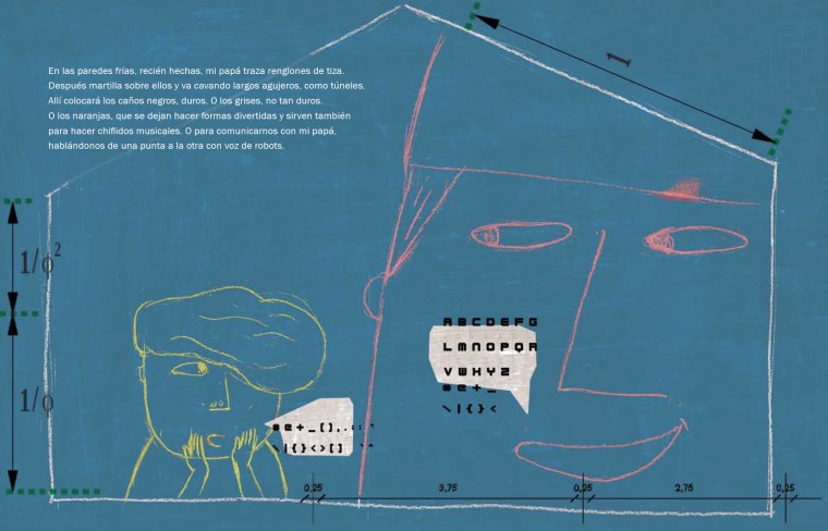 En las paredes frías, recién hechas, mi papá traza renglones de tiza. Después martilla sobre ellos y va cavando largos agujeros, como túneles. Allí colocará los caños negros, duros. O los grises, no tan duros. O los naranjas, que se dejan hacer formas divertidas y sirven también para hacer chiflidos musicales. O para comunicarnos con mi papá, hablándonos de una punta a la otra con voz de robots.