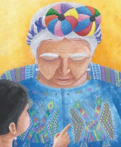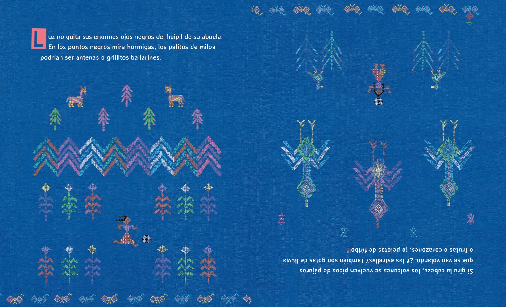 Vincular lectura y arte textil es otro acierto, bastante inédito en álbumes ilustrados. Hoy sabemos que los incas usaban ideogramas textiles para registrar sus historias, que las figuras en muchos huipiles mayas no son «decoraciones» ni están colocadas ahí aleatoriamente, que las formas que han tenido las mujeres de comunicarse -abierta o secretamente- a través de los símbolos incluían bordados y brocados…
