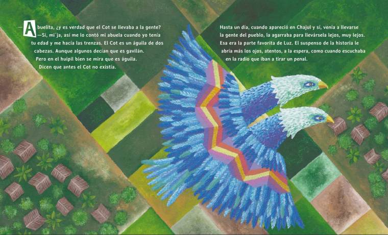 El momento en que la abuela le hace sus trenzas es el momento de las preguntas. Un día, al ver el Cot bordado en su huipil, la nieta le pregunta si es verdad que ese personaje se llevaba a la gente. El Cot es un águila con dos patas, dos alas y dos cabezas. «¡Dos cabezas!. ¿Te lo imaginás jugando fut abuelita?, ¡doble cabezazo!».