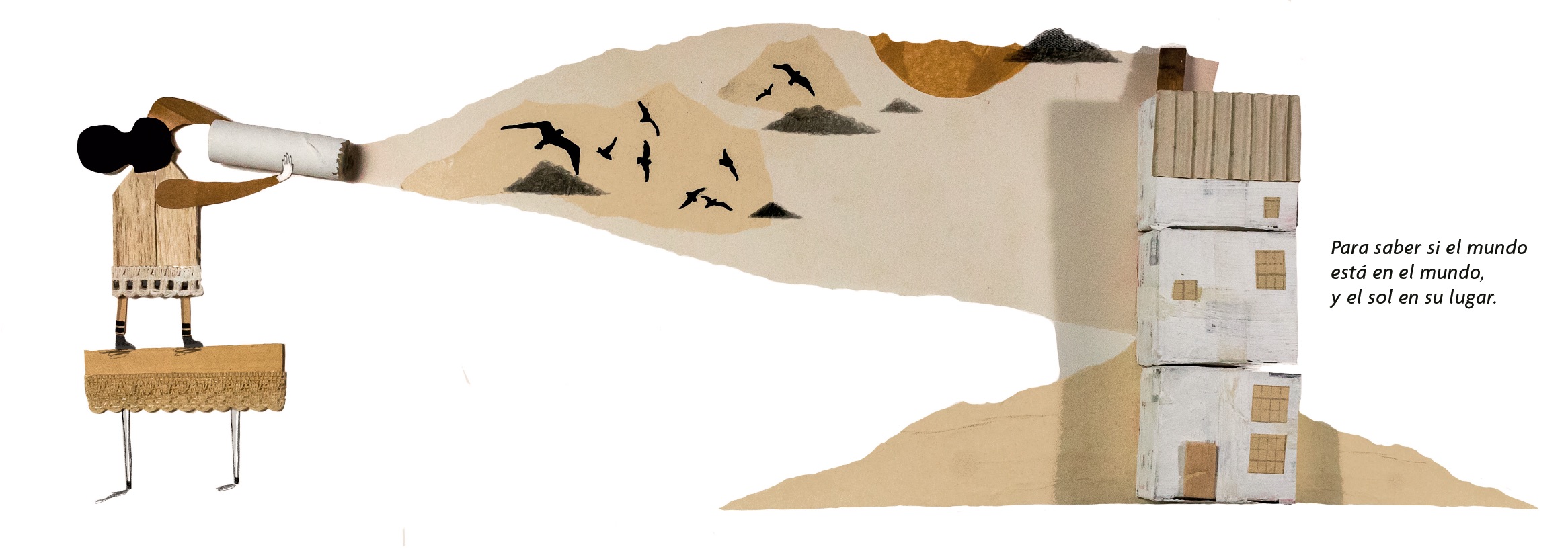 Aquí la artista sigue demostrando su sensibilidad para el difícil arte de ilustrar poesía, probando ahora la técnica del collage y un tipo de ilustración con fotografía de objetos de la que han hecho escuela Pep Carrió e Isidro Ferrer. Sus diagonales como de papel rasgado dejan «ver» otro plano, dan una sensación de profundidad que se corresponde con los volúmenes de los objetos. La preeminencia del blanco, también importante en Donde vive la música, y el rostro sin rasgos de la niña son espacio para la imaginación poética que no restan emotividad.