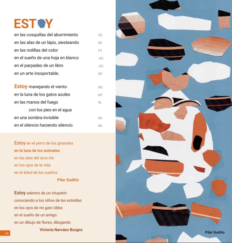 Y así se fueron armando los poemas corales y poemas de autor que componen cada página. Alguno de los «versos-voces», como los llama Katz, en cada poema coral, es ilustrado por otro collage, este no de palabras, sino de papelitos de colores. La elección de esta técnica, ejecutada con pulcritud y potencia, es congruente, pues el collage nos invita a crear algo nuevo de lo ya existente. De alguna forma, toda creación es collage y les niñes son especialistes en ello.