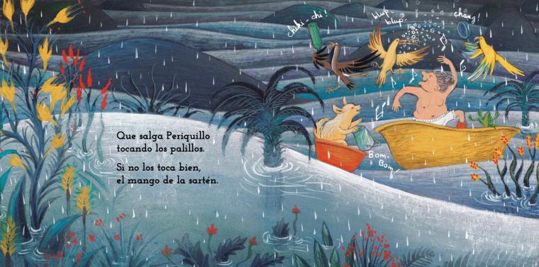 Pero el baño de lluvia se torna diluvio, y la tina, arca. Han de navegar dando un concierto, libres y felices… y sin que a nadie le toque un sartenazo por desafinar, aunque así lo advierta la canción.