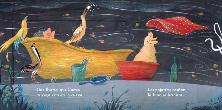 Todo indica que presenciaremos un ritual de baño. La anciana, de mandil, collar de perlas y botas de hule, saca de su cueva una tina con rueditas. La acompañan tres aves: un loro tricahue, se adelanta con la toalla; una bandurria, carga en el pico el jabón; y un Tero, demorado, que llega en la página siguiente con una cubeta. Ahí viene también el perro labrador. Mientras la anciana se desviste, «que sí, que no», el perro le canta.