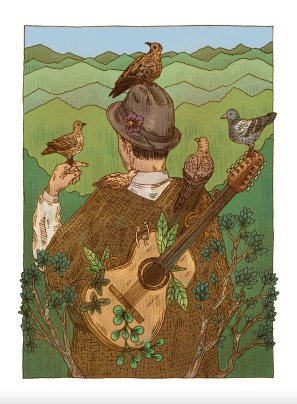 El primer verso de un poema dice: «El gallo abre su pico y sale el sol». Ahí está el canto hecho luz en la metáfora, y en la ilustración: una banda de músicos animales, guiados por el gallo, amanece.