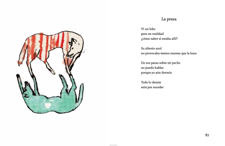 Palabras manzana fue uno de los primeros libros de Jorge Luján. Lo publicó originalmente la editorial Anaya en España, en 2003, ilustrado, también excepcionalmente, por Manuel Marín. Yo llevaba muchos años deseando conseguir un ejemplar. Pude leer el poemario completo en 2017, mientras continuaba la investigación para mi antología Cajita de fósforos, en el CEPLI, en Cuenca, y desde entonces admiré la variedad de formas en el volumen: poemas con rima y sin rima, con métrica clásica y libre de ésta, de apenas un par de versos, como greguería o retahíla, o integrando acrós­ticos, con tono de haikú o de ronda, usando hemistiquios que par­ten palabras, proponiendo juegos visuales y verbales… Sobra decir que fue difícil elegir sólo un poema. Su exploración de temas o tradiciones poéticas (hablar de la naturaleza, animar los objetos, plantear preguntas…) también es amplia.
