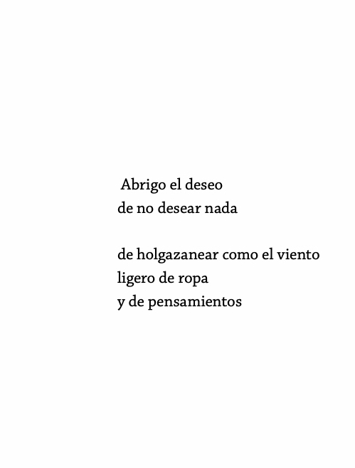 Los últimos versos de otro poema dicen: «Yo soy muy diferente de mi cuerpo / pero lo elijo entre todos / porque me deja ver por sus ojos». Y para esta observación ontológica: un humano tendido sobre el suelo invisible de la página mira un insecto enorme desplegar sus alas imposibles, ¿hay dos ojos que nos miran en sus alas?