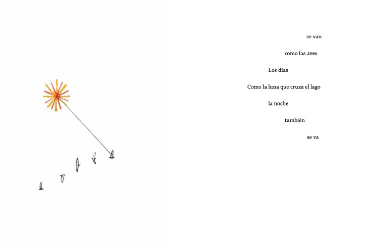 Un caligrama reproduce a una bandada en vuelo o es un pájaro hecho de palabras que dice: «se van / como las aves / Los días» y también: «Los días / como las aves / se van / Como la luna que cruza el lago», y en la ilustración: aleteos en distintas fases y un ave que lleva en su pico el cordel de una cometa-sol. La tensión justa entre la literalidad imagen-texto y su reelaboración metafórica hacen que lector o lectora se sume a la bandada de significados y no vuele hacia otros libros.