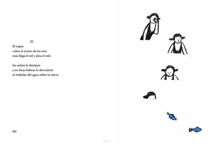 Este libro me remite a otro objeto: un caleidoscopio. Lo abro, me asomo, quiero descifrarlo. Leo y veo girar sus cristales de colores hechos de pausas y sonidos. Son tres espejos que se miran: poemas, ilustraciones y espacio blanco, un prisma triangular cuyas combinatorias me sorprenden en cada vuelta de página.