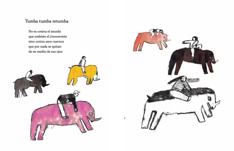 Este berrinche también marca el regreso de la emblemática colección «Rimas y adivinanzas» de Ekaré. Las responsables del doble rescate son asimismo Araya Goitia Leizaola y Alejandra Varela, a quienes mencionaba por Arroz con leche, una nueva generación de editoras que seguramente creció con estas colecciones y ahora dan continuidad diversificando a los personajes retratados.