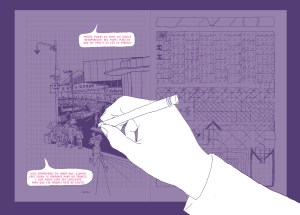Inspirado en su padre, Gonzalo Peña, el autor comienza esta novela gráfica presentándolo y situándonos en una realidad particular: la de la pérdida de ciertos oficios por el avance de la tecnología: «Pienso mucho en cómo los oficios desaparecen, del mismo modo en que me pasó a mí con la fábrica. Vivo sorprendido de saber que, cuando eres joven, te preparas para un trabajo, y que media vida sea suficiente para que ese trabajo deje de existir», nos cuenta la voz del padre, pero también confiesa que siempre quiso ser dibujante. Entonces Emmanuel inicia sus juegos metaficcionales, su puesta en abismo: entramos a un supuesto cómic dentro del cómic, el que su padre dibujó, sobre un dibujante dibujando y que pierde su trabajo, reemplazado por la Inteligencia Artificial. Aceptará uno nuevo, como paseador de perros… hasta que nuevamente es reemplazado…