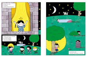 La linterna es estrella. El bosque, noche… Y la lectura, un cometa… O la lectora es estrella que atraviesa la noche y sobrevuela iluminando el mundo… en el cómic del cumpleaños 12 que me envió Rosario Lucas. Su ilustración inspiró esta entrada, y su trabajo, independiente y autogestivo, resuena con este blog que empecé a escribir para hablar con libertad de la literatura infantil y juvenil. Rosario, como muchas artistas y narradoras gráficas, crea y comparte sin esperar la aprobación de una editorial. Usa Instagram, con esa estructura de viñetas que se deslizan tan pertinente, para desplegar una fuerza expresiva que surge de su compromiso con la narración visual como forma de pensamiento y de denuncia, y de su sensibilidad para traducir experiencias, afectos y tensiones sociales a la imagen.