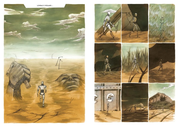 Volver atrás: reiterar un pasado para hablar de un futuro. Varios gestos paradójicos sostienen esta novela gráfica en la que al androide VA-42 se le ha encomendado la misión de salvar a la humanidad, aunque fueran primero las máquinas quienes casi la destruyeran. Ese destino fatídico, clásico de la ciencia ficción, aquí propone un cruce con preguntas sobre el origen y la tendencia, reconocible en la LIJ contemporánea, de «volver atrás» a la naturaleza, a una identidad originaria. Pero, ¿cuál puede ser la identidad primigenia de un robot?, ¿de este robot, VA-42? «¡No eres un salvador, ni el ejecutor de la justicia de nuestro padre! ¿Quién eres entonces?», lo cuestiona otro personaje. Y ¿cuáles son las naturalezas/modos de existencia de esta realidad?